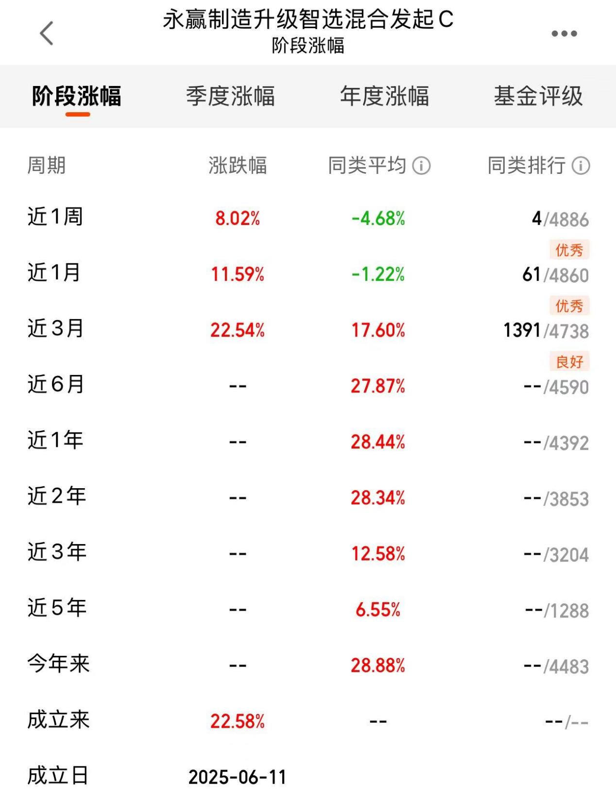在这个充满希望的赛道中,永赢制造升级智选混合发起C(024203)表现格外亮眼。该基金近一周上涨8.02%,近一月涨幅达11.59%,近三个月更是实现了22.54%的可观回报,展现出对前沿科技趋势的精准把握能力。
