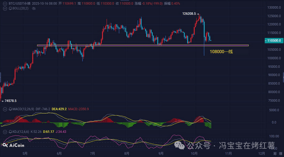 四小时图显示,价格在布林带下轨附近,底部吸筹中,K线反复测试支撑。布林带三轨平行,开口有扩大趋势,市场即将选择方向,预计继续试探108000支撑。
