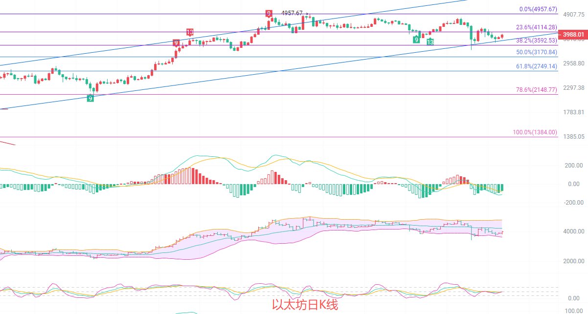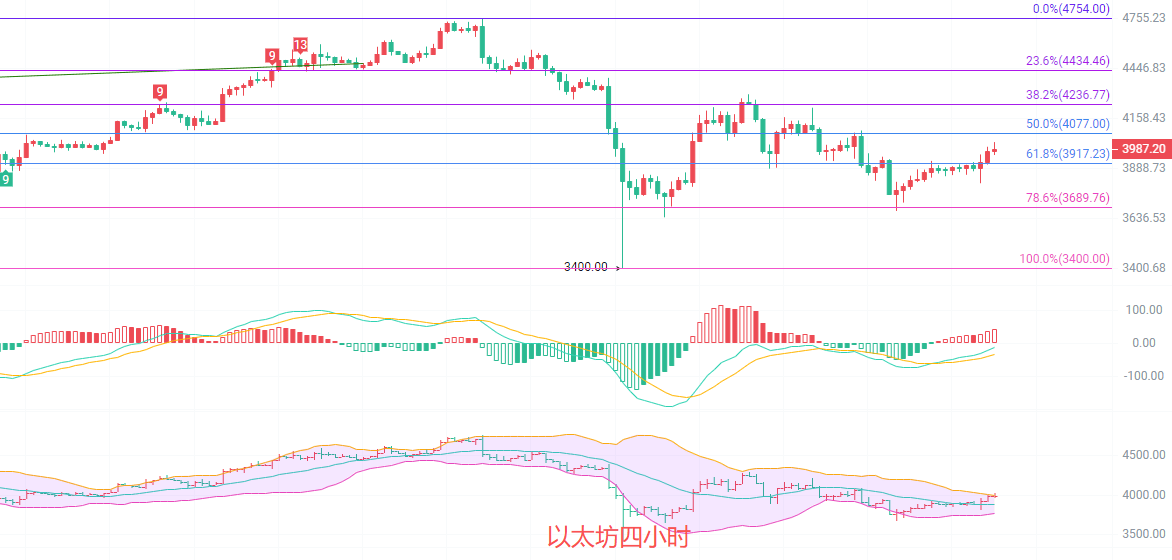 日K线,K线回到了趋势指标内,承压短线两个位置,MACD连续缩量减少,DIF和DEA出现收缩,行情离开了布林带下轨3645向上扳回,上轨关注4208,今天周一不排除行情走单边的情况,注意做好风控