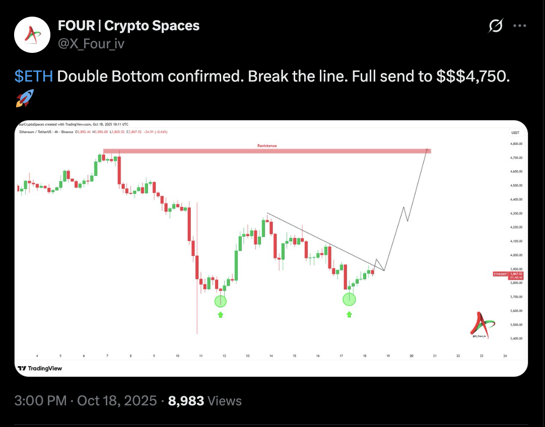 中期上涨目标与分析师FOUR的双底技术设置一致,该设置显示ETH价格将在未来几天达到结构的颈线美元。