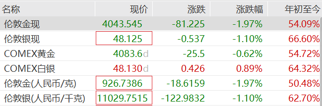 黄金股再度走低,哈莫尼黄金、盎格鲁黄金跌逾4%,金罗斯黄金跌近4%。现货黄金延续跌势,截至发稿,跌1.97%,报4043.535美元/盎司,逼近4000美元关口。