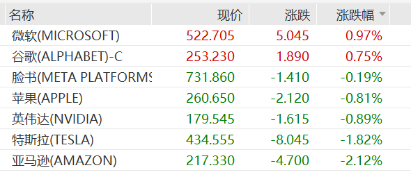 科技七巨头跌多涨少,谷歌涨0.75%、微软涨近1%,特斯拉跌1.82%,亚马逊跌超2%。消息面上,10月20日亚马逊云服务大规模宕机15小时,损失至少数十亿美元,波及上千家企业。