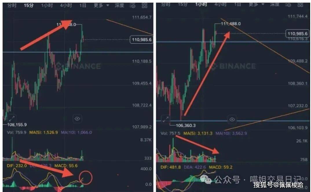 BTC夜里再次回踩,但仍然没有扎破空套区, 目前1小时级别缩量上涨,15分钟级别macd三重顶背离可能(等待交叉),接下来只需观察趋势线破位时的量能,大成交则可打破缩量以及破坏macd顶背离,从而延续上涨。