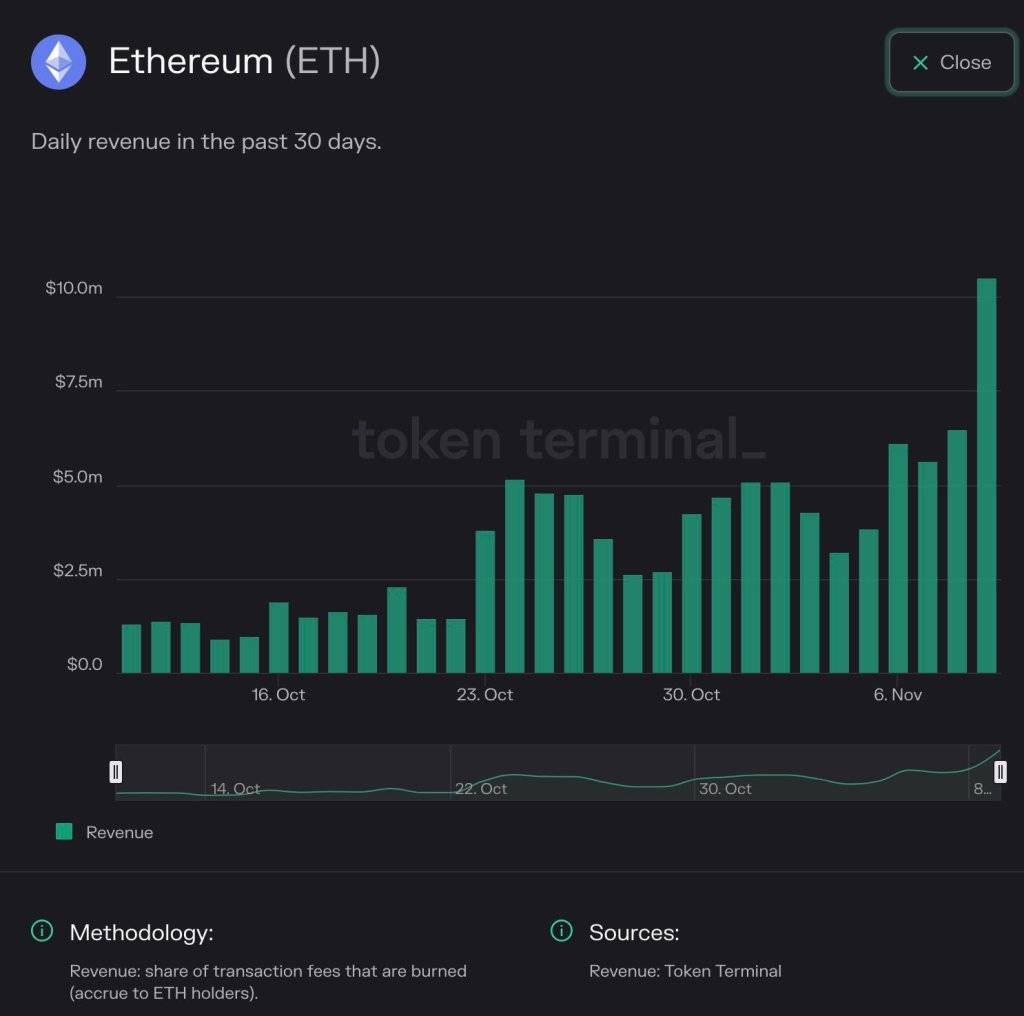 根据Token Terminal的数据,在11月的前十天内,以太坊的日均收入呈现出稳步上升的趋势。从趋势分析来看,本月前五天的平均每日收入已经翻了一番,从500万美元上升至新的水平。一般而言,网络中日均收入的增加通常意味着链上活动的增加,不论是通过智能合约的部署还是简单的转账,这都需要支付燃气费用。
