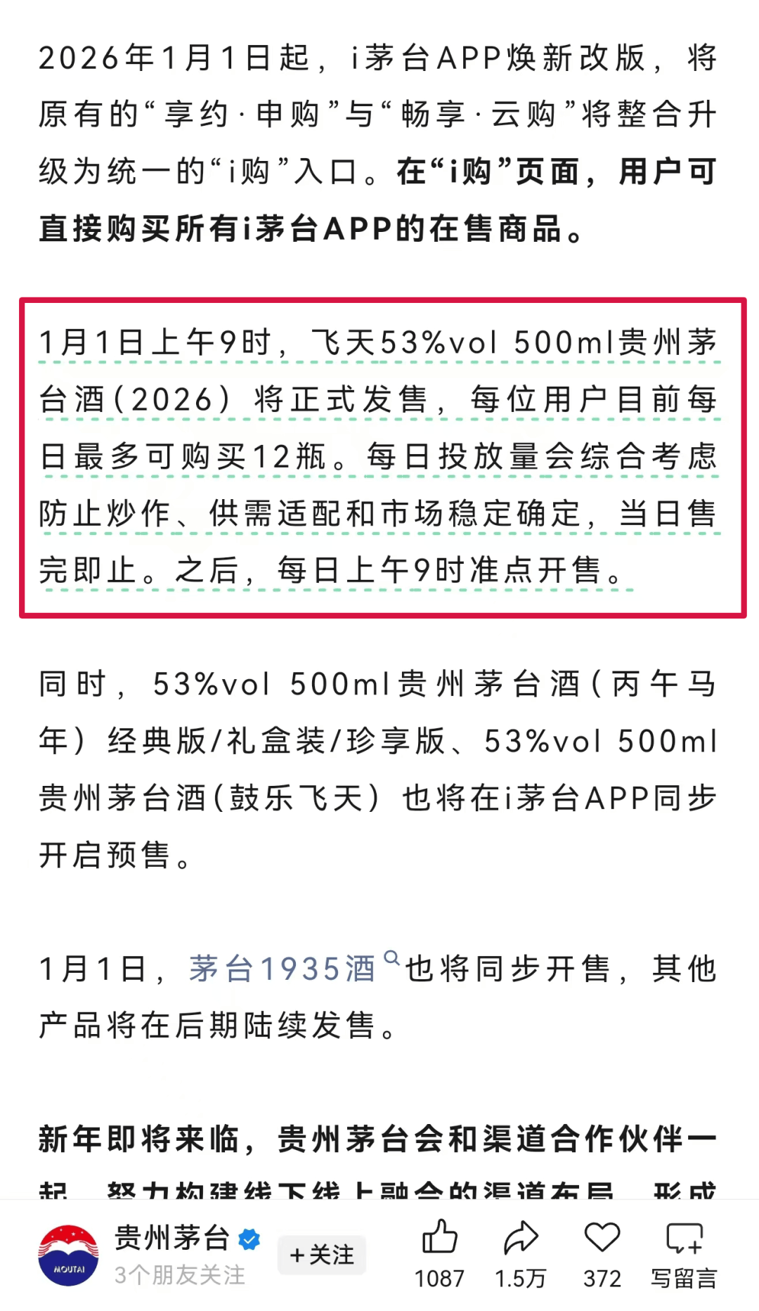 自2026年1月1日起,53度500ml飞天茅台将以1499元的官方指导价正式上线销售。每日投放量会综合考虑防止炒作、供需适配和市场稳定确定,当日售完即止。之后,每日上午9时准点开售。