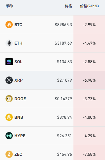加密货币集体大跌,截至15:00,比特币跌破90000美元,日内跌近3%;以太坊跌一度破3100美元,日内跌超4%。近24小时全市场近12万人被爆仓。