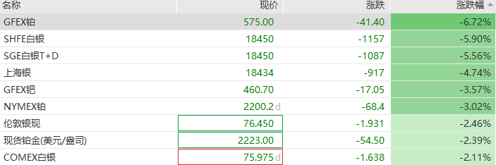 金属市场全线大跌。截至发稿,现货白银跌超2%,现货黄金跌0.4%。国际铜、沪铝、沪铜跌超2%。
