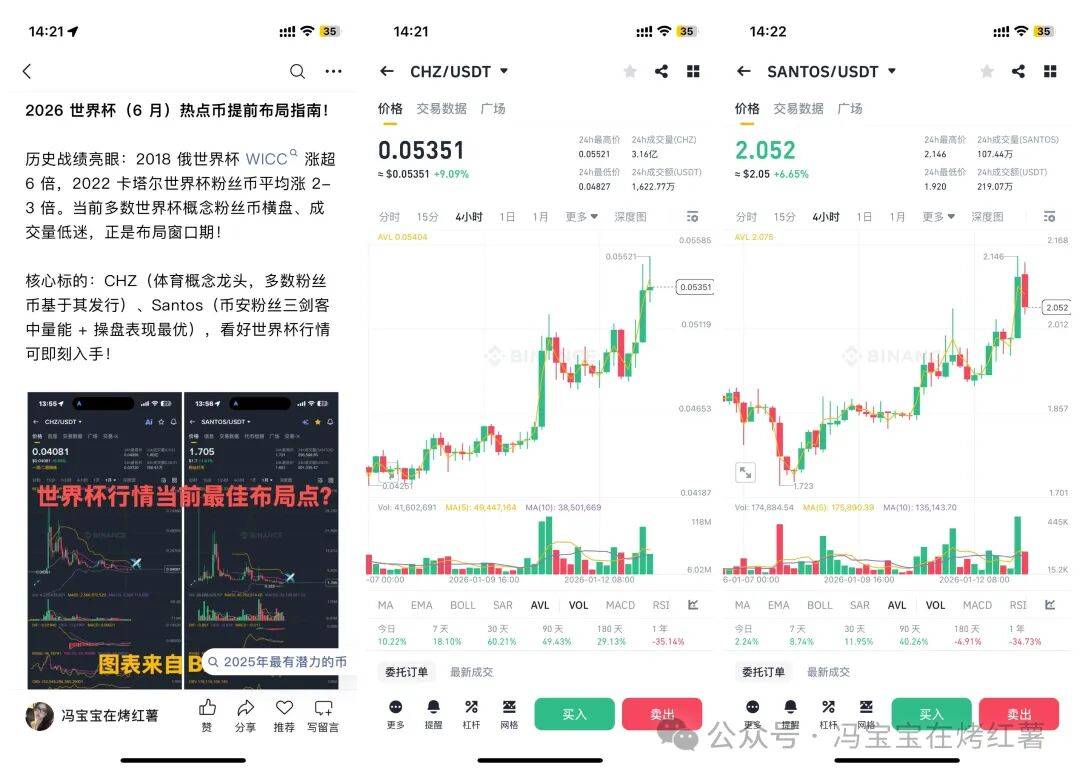 粉丝币赛道也刚启动,龙头CHZ走出趋势,B安系SANTOS也开始拉盘。这些币我都有在跟踪,今年现货赚钱难,世界杯行情是确定热点。
