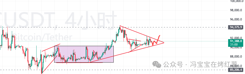 小级别可在90000-90300区间做多,突破后看93000-94000区域。从4小时级别看,后续还有一波上涨,至少会出现一个次高点。