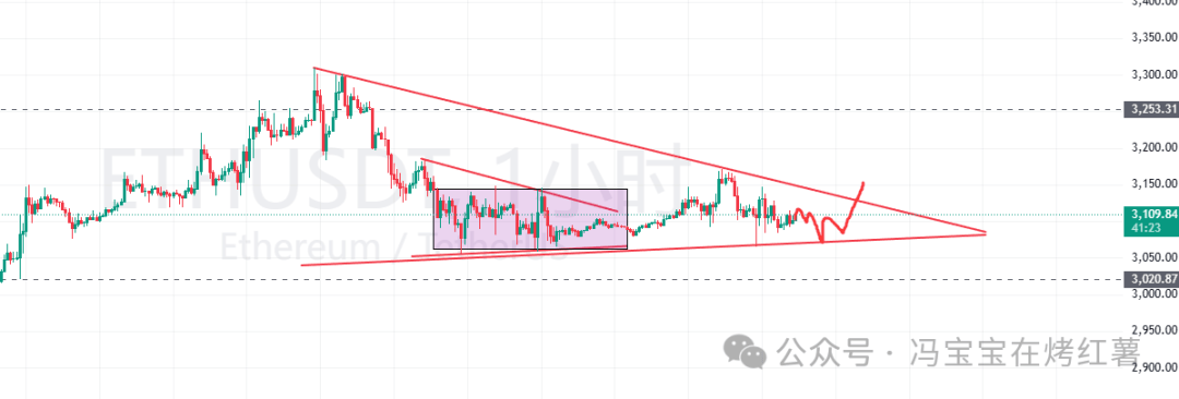 以太坊小级别呈现三角形整理形态,价格触及上沿后承压回落,显示上方有一定抛压,目前仍处于调整蓄力阶段。短期等待价格回调至3056附近布局多单,该位置是近期低点强支撑区,只要不跌破,有望再次向上反弹,上方目标可看3180-3200压力区间。