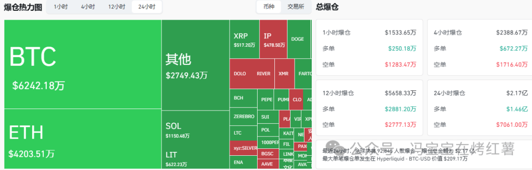 过去24小时全网共有92,845人被被爆仓,爆仓总金额为$2.17亿美元,多单爆仓1.46亿美元,空单爆仓7061.00万美元。