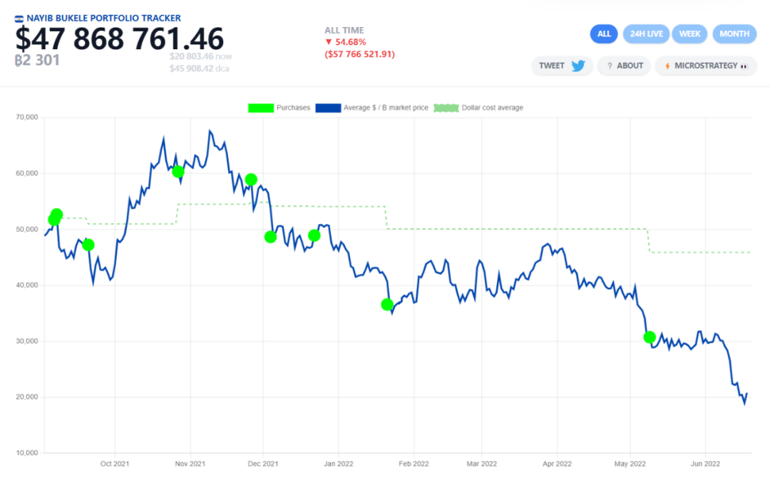 据追踪该国比特币资产的网站计,萨尔瓦多的购币总成本为1.05亿美元,平均购买价格近4.6万美元/枚。按照比特币最新的价格(20803美元),萨尔瓦多手中的比特币已经浮亏54.68%。