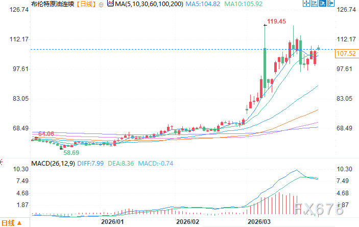 汇通财经APP讯——随着伊朗战争持续,周一(3月30日)亚市时段,布伦特原油价格震荡上行,主力合约6月期货合约现交投于每桶107.70美元附近,对比前一交易日结算价,日内涨幅约2.8%,布伦特原油价格...