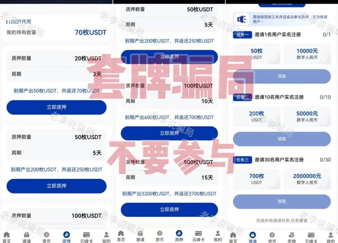 冒用“香港云峰金融集团”名义制作假冒APP,以“质押虚拟币赚取收益”为诱饵,吸引不明真相的参与者。
