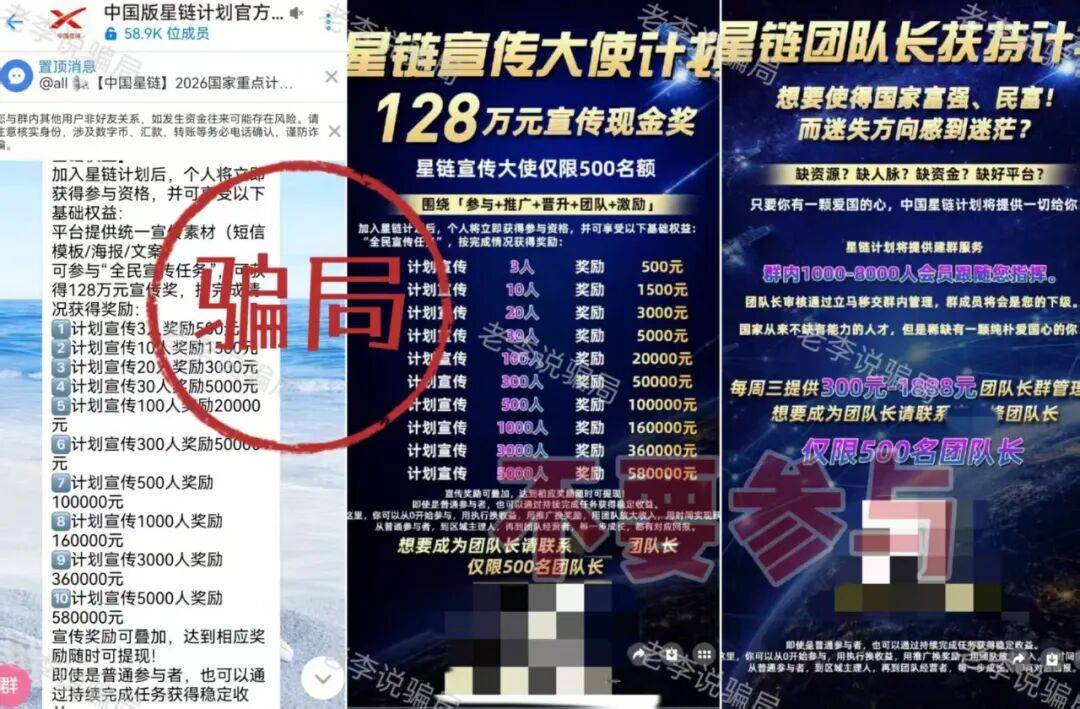 打着“”星链计划”旗号,以招募“宣传大使”的名义忽悠大家在某境外聊天软件内添加陌生好友提交个人信息。利用“高额拉新奖励”、“团队管理奖”刺激参与者不断拉人。