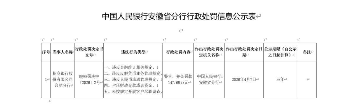 2026-04-18米兰体育,米兰体育官方网站,米兰体育APP下载近日,中国人民银行安徽省分行对招商银行股份有限公司合肥分行(下称 “招行合肥分行”)开出行政处罚罚单,该行因统计、反假、人民币流通、财政存款、客户尽调五项违法违规事实被警告并罚款147.69 万元,凸显央行对地方银行合规经营的严监管态势。