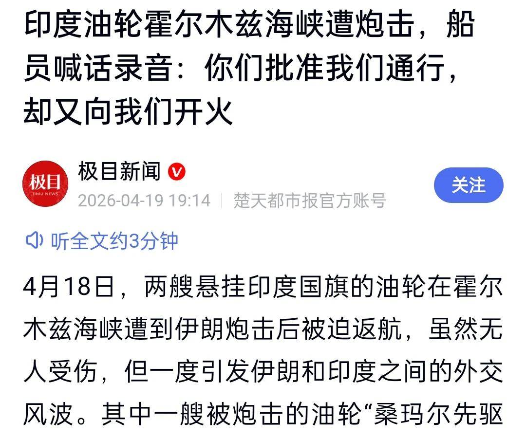 事后被放出的无线电通话记录里,印度船员绝望呼喊“你们已经给了我通行许可”,但伊朗方面并不认同,还是坚决打击的态度,于是印度油轮最后呢被揍后返回,闹剧感拉满。