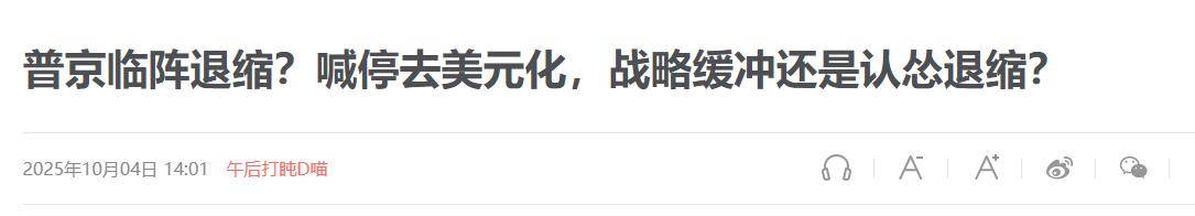 与印度的谨慎形成对照,俄罗斯过去一直在金砖里扮演“去美元化”的急先锋。可在2025年10月的瓦尔代论坛上,普京发话让局势有了新变化:俄罗斯不打算反美元。之前之所以要“摆脱美元”,更多是因为美国制裁带来的现实压力,而不是出于主动的长远规划。
