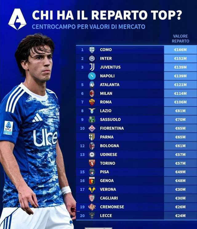 德转网站对意甲各俱乐部球员进行了身价统计,其中后卫及门将的总身价上,国际米兰以2.7亿欧元排名第一,AC米兰紧随其后,罗马位列第三。在中场球员身价方面,科莫以1.66亿欧元居首,国米排名第二,尤文图斯与那不勒斯并列第三。前锋身价方面,尤文以2.31亿欧元位居第一,国米紧随其后,米兰位列第三。